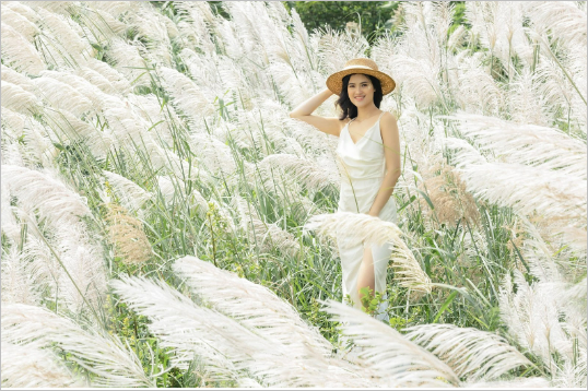 Cỏ lau là đặc sản chỉ xuất hiện vào khoảng cuối hè, gần sang thu. Thảm cỏ lau đẹp lung linh trên nền trời xanh thẳm sẽ là background tuyệt vời cho bạn tha hồ diễn. Với concept này, bạn nên mặc váy nhẹ nhàng, thướt tha, tạo dáng đang đi và nghiêng người nhìn lại để khuôn mặt và thân thể có vẻ thon gọn, thướt tha.