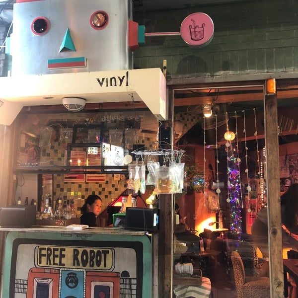 Nếu bạn đi bar ở Hàn Quốc thì không thể bỏ qua Vinyl. Đây là một quán bar mang phong cách mộc mạc, giản dị. Quán được trang trí bởi những chiếc bàn gỗ thấp, được sơn nhiều màu cùng với những tác phẩm nghệ thuật hiện đại.